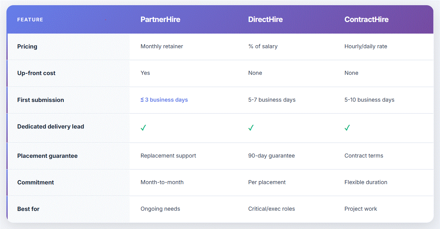- Placement Guarantee: If a hire doesn't work out within the guarantee period, we'll find a replacement at no additional cost.